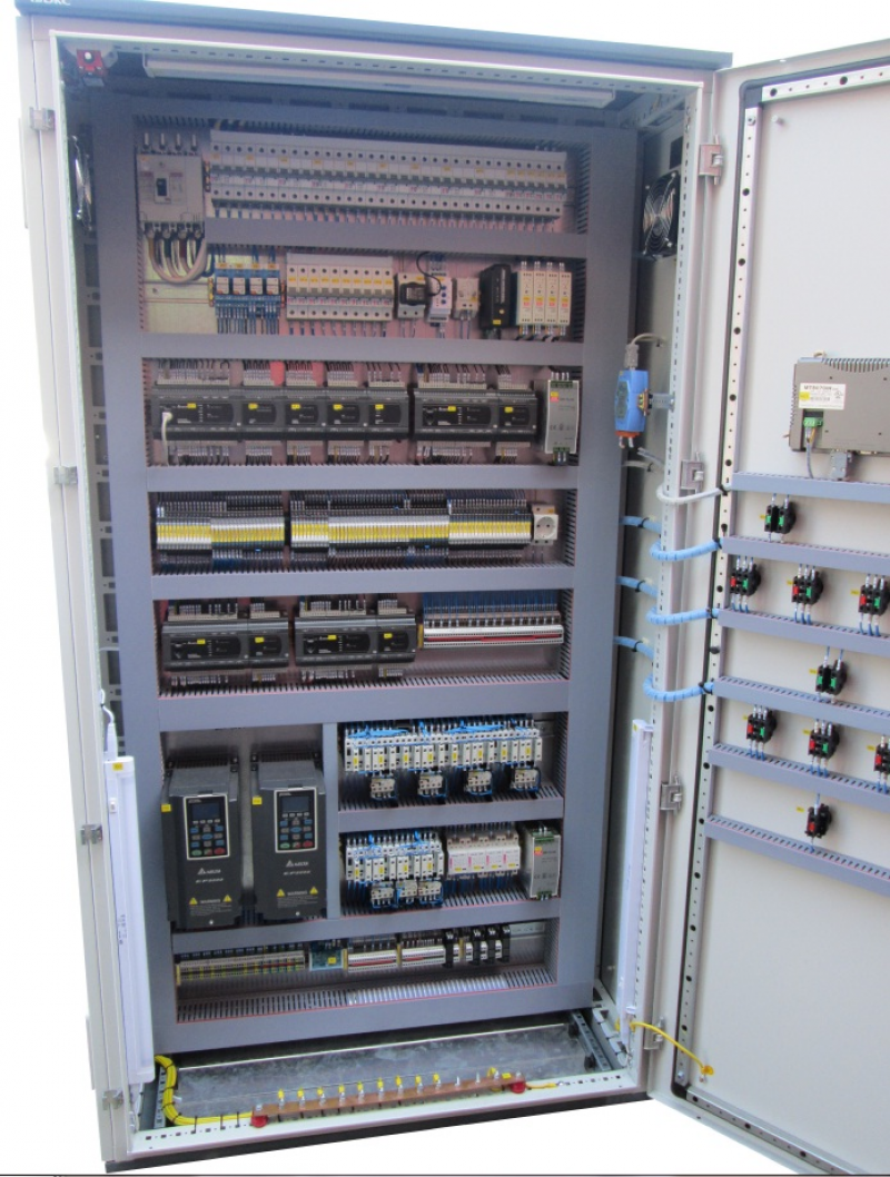 Шкаф представляет из себя средний уровень автоматизации и служит для сбора технологичной информации о состоянии технологического процесса водоочистки, обработке полученной информации и управления исполнительными механизмами.